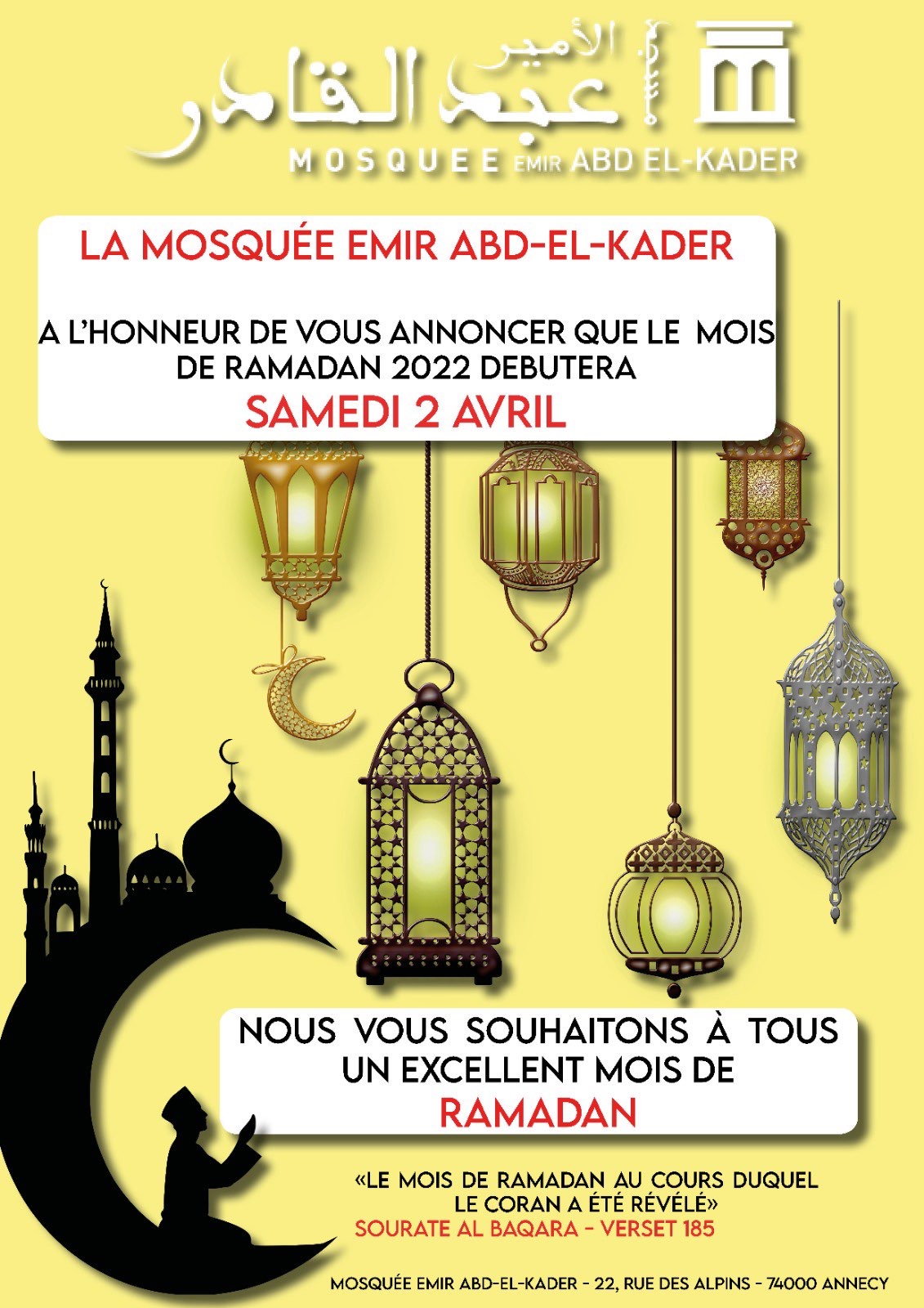 Votre mosquée vous annonce que le mois béni de Ramadan commencera jeudi 23 mars inshaAllah.